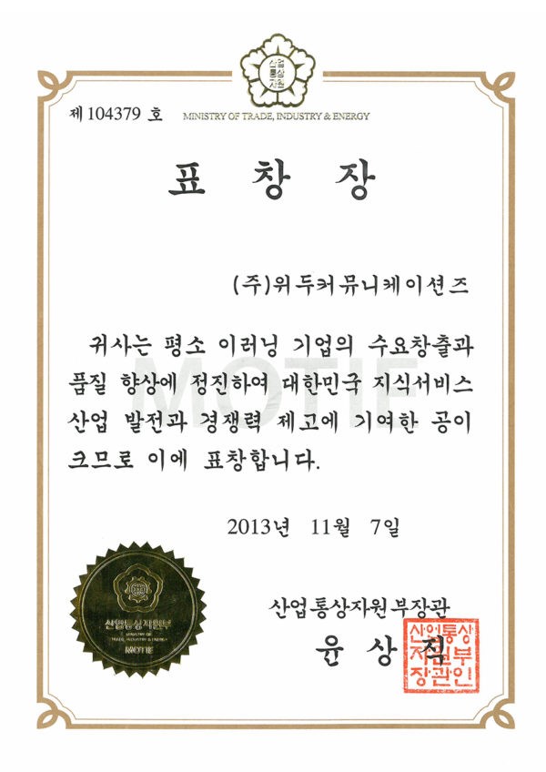 이러닝 기업의 수요 창출과 품질 향상 페이지 정보 작성자 WeDu 댓글 0건 조회 6,184회 작성일 19-05-30 19:32 본문 2013-11-07 표창장 제 104379호 이러닝 기업의 수요 창출과 품질 향상 산업통상자원부장관 윤상직 List Previous한국여성벤처협회 표창장 19.05.30 Next이러닝 콘텐츠 품질 인증 우수 심사 19.05.30