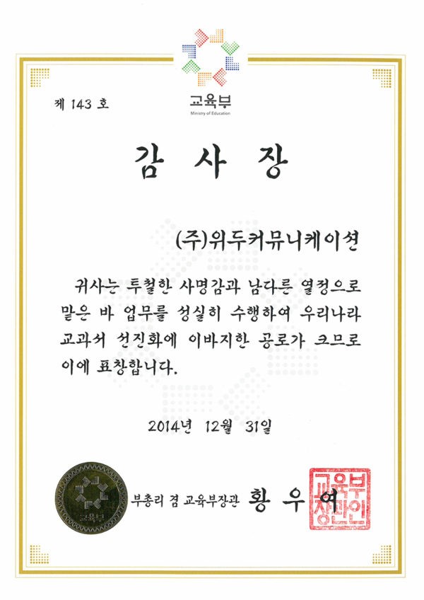 감사장 제 143호 페이지 정보 작성자 WeDu 댓글 0건 조회 6,309회 작성일 19-05-30 19:33 본문 2014-12-31 감사장 제 143호 교과서 선진화 부총리 겸 교육부장관 황우여 List Previous산업통상자원부 표창장 19.05.30 Next한국여성벤처협회 표창장 19.05.30