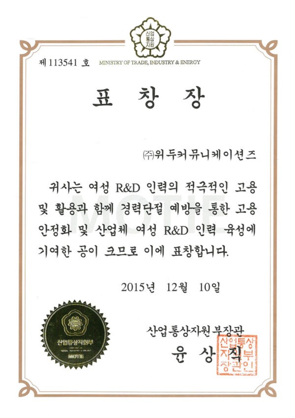 산업통상자원부 표창장 페이지 정보 작성자 WeDu 댓글 0건 조회 6,505회 작성일 19-05-30 19:34 본문 2015-12-10 표창장 제 113541호 여성 R&D 인력 고용 산업통상자원부장관 윤상직 List Previous서울클러스터 어워드 우수상 19.05.30 Next감사장 제 143호 19.05.30