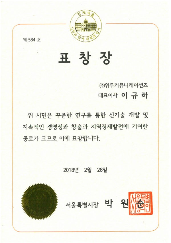 서울특별시장 표창장 페이지 정보 작성자 WeDu 댓글 0건 조회 7,013회 작성일 19-05-30 19:35 본문 2018-02-28 표창장 제 584호 신기술 개발 및 지속적인 경영성 창출, 지역 경제 발전 기여 서울특별시장 박원순 List Previous2018 소년한국 우수 어린이 도서 19.05.30 Next서울클러스터 어워드 우수상 19.05.30