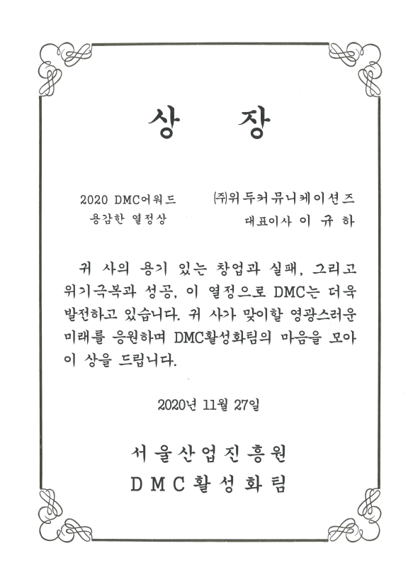 2020 서울산업진흥원 2020 DMC어워드 페이지 정보 작성자 WeDu 댓글 0건 조회 5,985회 작성일 21-12-31 12:57 본문 2020-11-27 2020 DMC어워드 용감한 열정상 서울산업진흥원 DMC활성화팀 List Previous2020 기술혁신 우수기업 21.12.31 Next2018 소년한국 우수 어린이 도서 19.05.30