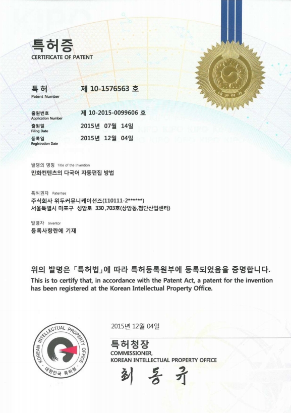 [한국/특허] 만화 컨텐츠의 다국어 자동 편집 방법 페이지 정보 작성자 WeDu 댓글 0건 조회 6,653회 작성일 19-05-30 18:49 본문 2015-07-14 특허 10-2015-0099606 만화 컨텐츠의 다국어 자동 편집 방법 List Previous[한국/특허] 전자서적과 연동되는 게임의 제공 장치 19.05.30