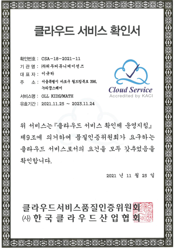 [한국/인증서] OLL KIDS/MATH 클라우드 서비스 확인서 페이지 정보 작성자 WeDu 댓글 0건 조회 10,082회 작성일 21-12-31 12:46 본문 2021-11-25 확인번호 CSA-18-2021-11 서비스명 : OLL KIDS/MATH List Previous[한국/확인서] OLL KIDS/MATH 파스-타 호환성 확인서 21.12.31 Next[한국/저작권] 장보기 인지훈련 게임 21.12.31