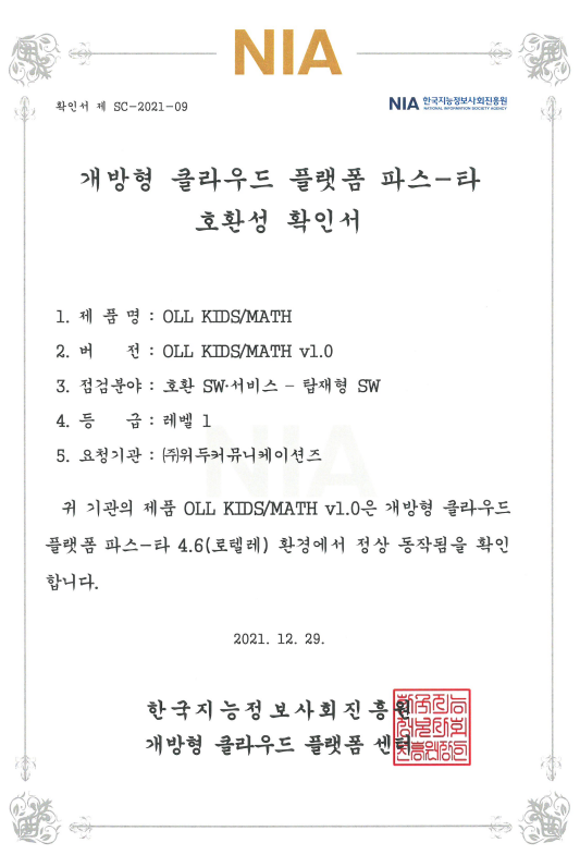 [한국/확인서] OLL KIDS/MATH 파스-타 호환성 확인서 페이지 정보 작성자 WeDu 댓글 0건 조회 10,744회 작성일 21-12-31 12:48 본문 2021-12-29 확인서 제 SC-2021-09 점검분야 : 호환 SW서비스 - 탑재형 SW List Next[한국/인증서] OLL KIDS/MATH 클라우드 서비스 확인서 21.12.31