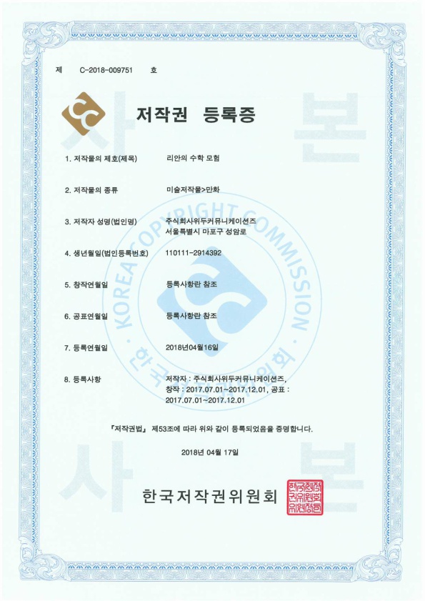 [한국/저작권] 리안의 수학 모험 페이지 정보 작성자 WeDu 댓글 0건 조회 6,303회 작성일 19-05-30 19:07 본문 2018-04-16 저작권 C-2018-009751 리안의 수학 모험 / 미술저작물>만화 List Previous[한국/저작권] 길리 19.05.30 Next[한국/저작권] 신입사원조기전력화 이러닝 콘텐츠 19.05.30